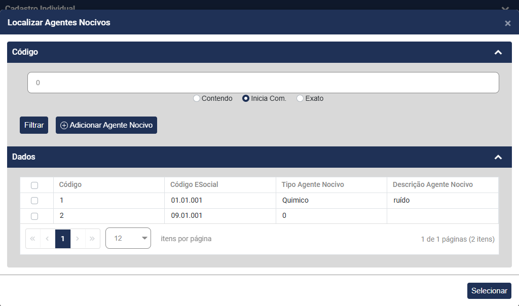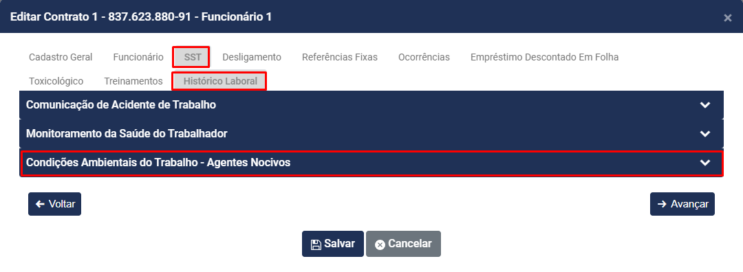 Aba SST>Histórico Laboral>Condições da Saúde do Trabalho - Agentes Nocivos