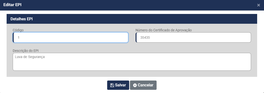Clique no botão Adicionar EPI e será apresentada a tela para que você cadastre um novo EPI (Equipamento de Proteção Individual), informe: