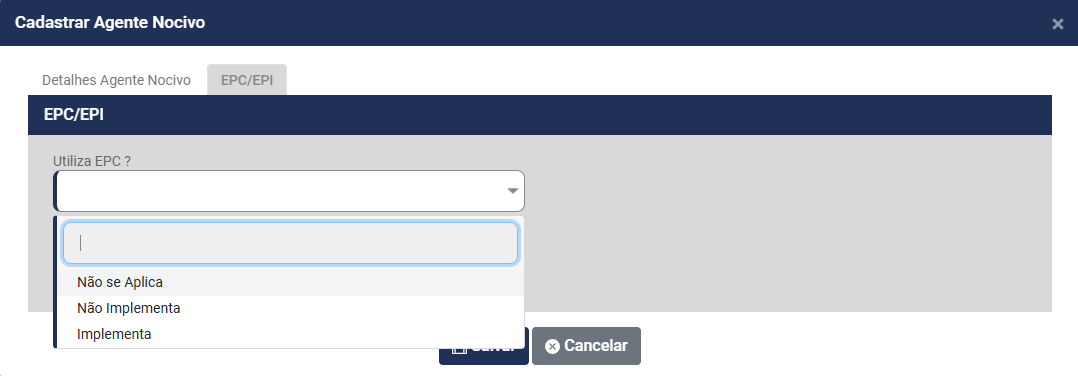 Nesta aba você deverá informar se Utiliza EPC (equipamento de proteção coletiva), para neutralizar o Agente Nocivo cadastrado anteriormente, com as opções:
