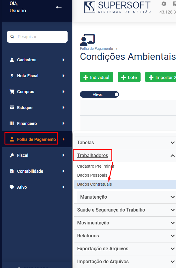 Você conseguirá visualizar também as Condições Ambientais do Trabalho - Agentes Nocivos do Trabalhador acessando o menu Folha de Pagamento>Trabalhadores>Dados Contratuais