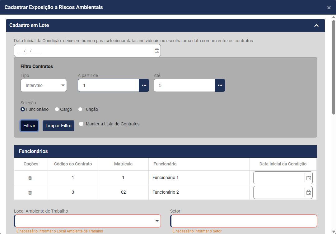 Clique em Lote para cadastrar as Condições Ambientais de Trabalho para uma faixa de Trabalhadores