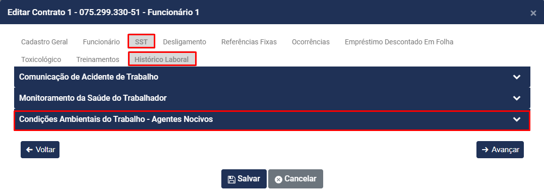Aba SST>Histórico Laboral>Condições da Saúde do Trabalho - Agentes Nocivos