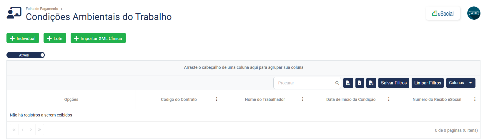 Cadastro de Condições Ambientais do Trabalho IndividualCadastro de Condições Ambientais do Trabalho em LoteImportação do XML da Clínica
