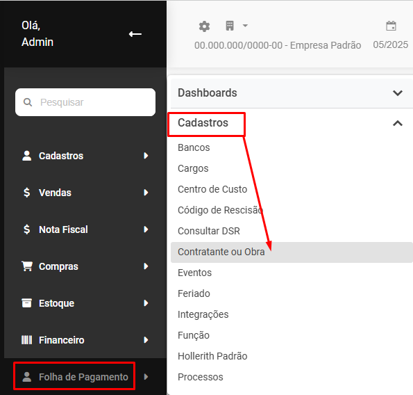 Para cadastrar os Contratantes ou Obras acesse o menu Folha de Pagamento>Cadastros>Contratantes ou Obras
