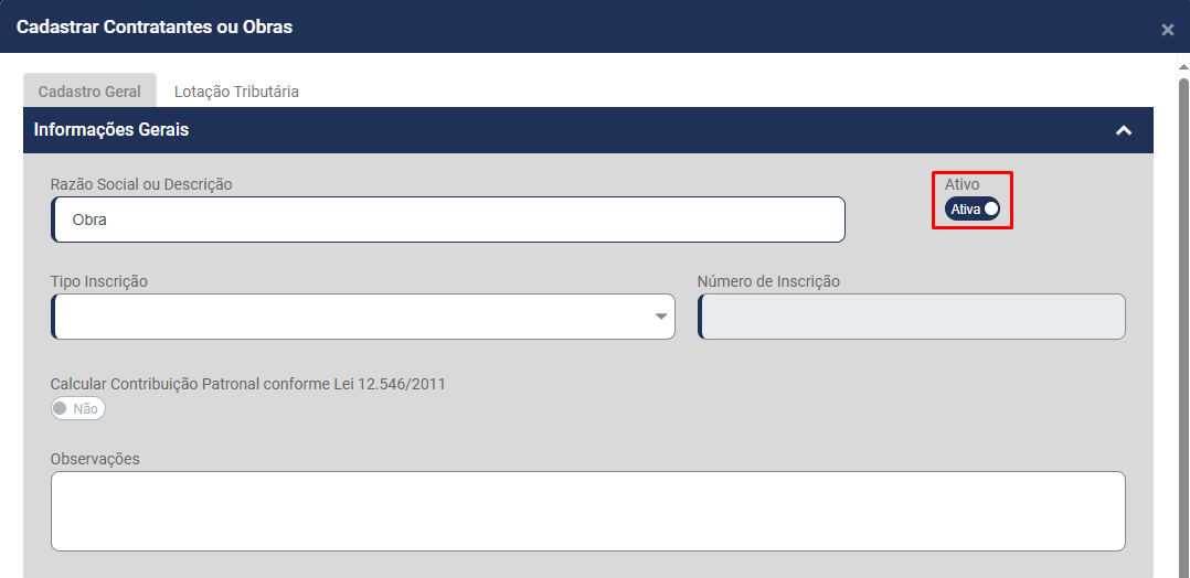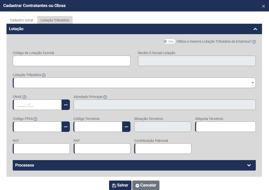 - Defina se Utiliza a mesma Lotação Tributária da Empresa - Ao selecionar esta opção sistema irá assumir as configurações da lotação da empresa vigente no período definido. Sempre que houver uma alteração na lotação da empresa estes dados serão alterados automaticamente para esta obra/contratante.
