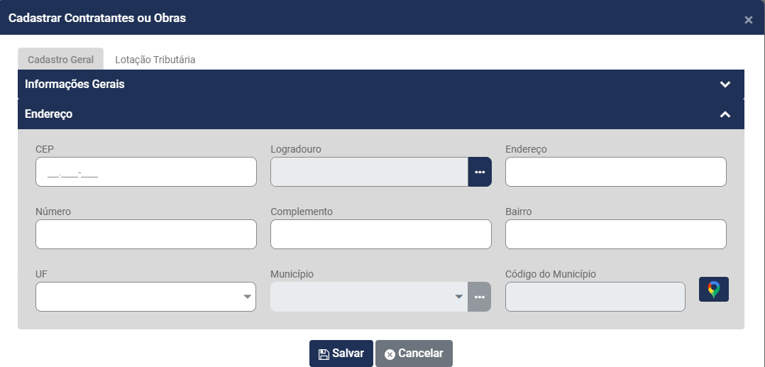 - CEP - Ao digitar o CEP o Sistema irá carregar as informações referente ao mesmo (Logradouro, endereço, bairro, UF, Município, Código do Município)