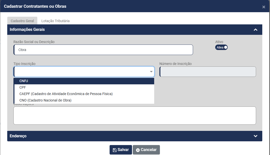 a) Quando o Tipo de Inscrição for CNO será aberta uma aba para que você informe o CNPJ ou CPF do Contratante e do Proprietário - Esse campo será obrigatório quando o tipo de empresa é Construção Civil e o Tipo de Lotação for 02
