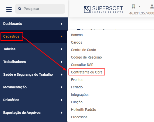 Para cadastrar os Contratantes ou Obras acesse o menu Folha de Pagamento>Cadastros>Contratantes ou Obras