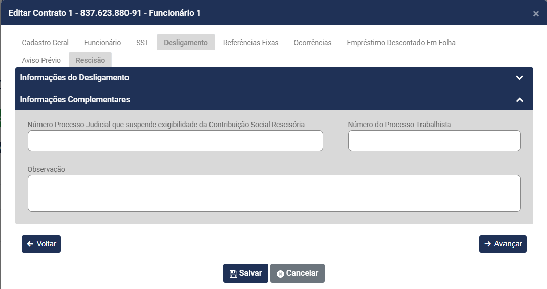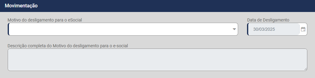 d.2) Rescisão - Os dados desses campos serão preenchidos automaticamente quando for gerada uma Rescisão Contratual para o Trabalhador e você poderá realizar o cadastro manual quando as informações já foram geradas em outro Sistema e no momento do cadastro das informações deseja que o trabalhador conste no banco de dados, desta forma será necessário também o cadastro das informações do desligamento do trabalhador.
