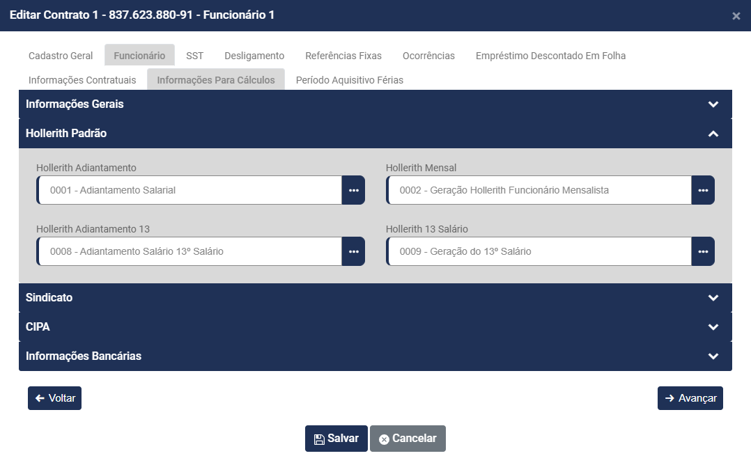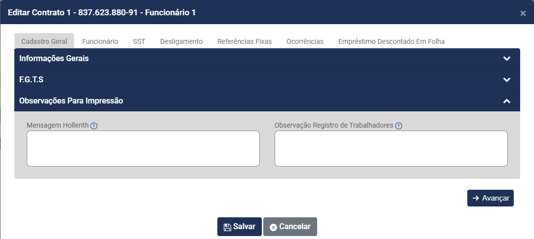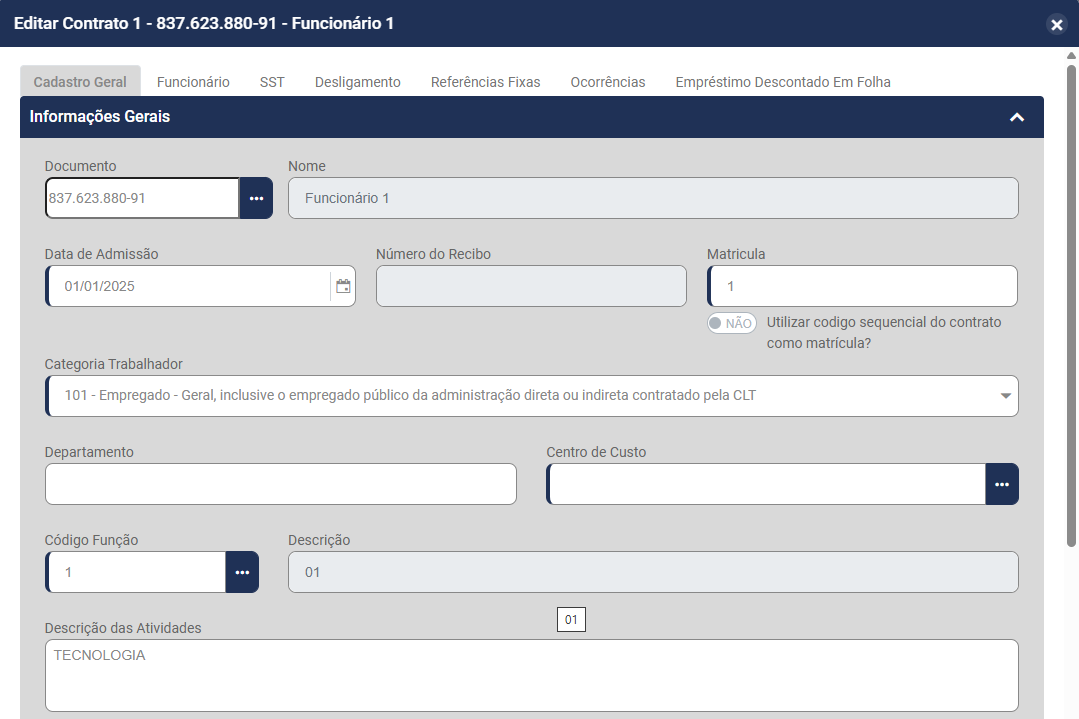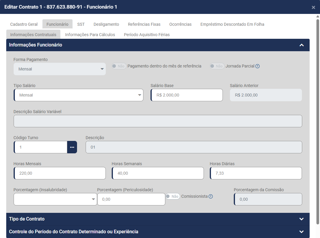 • Nome do funcionário - será preenchido automaticamente a partir do momento que você defina o Código do Contrato
