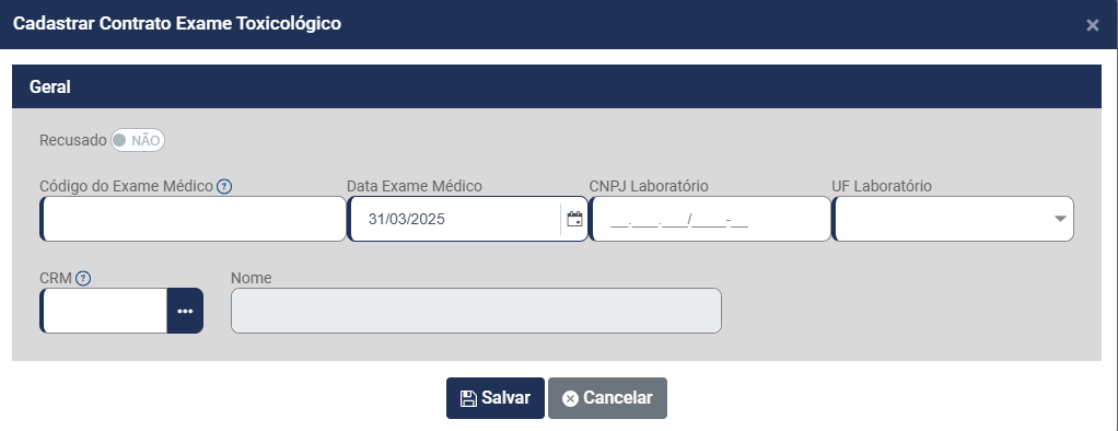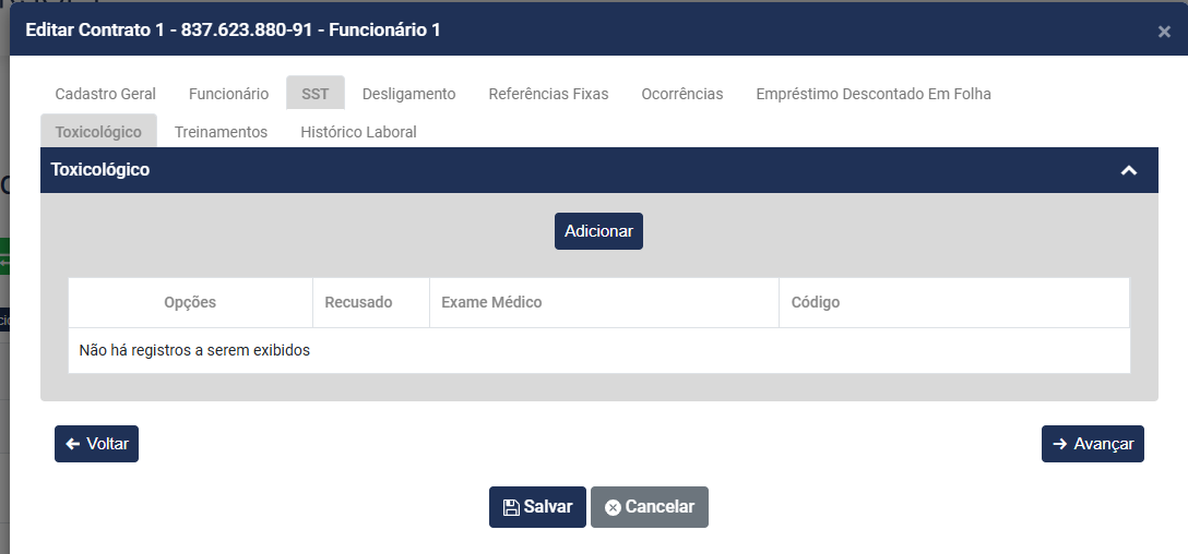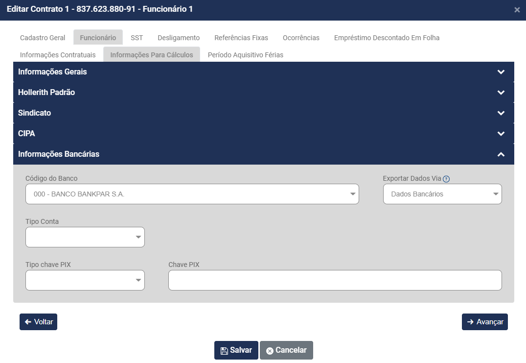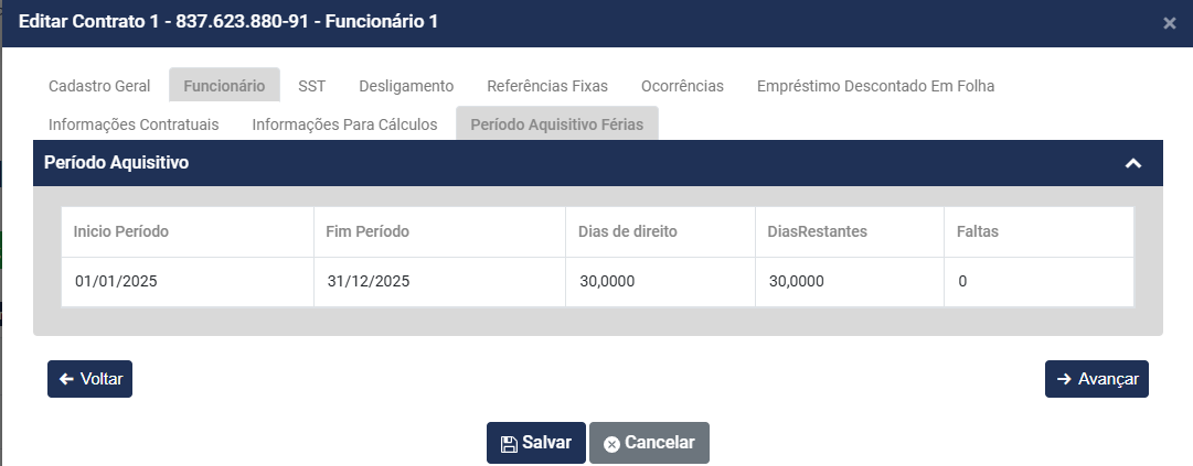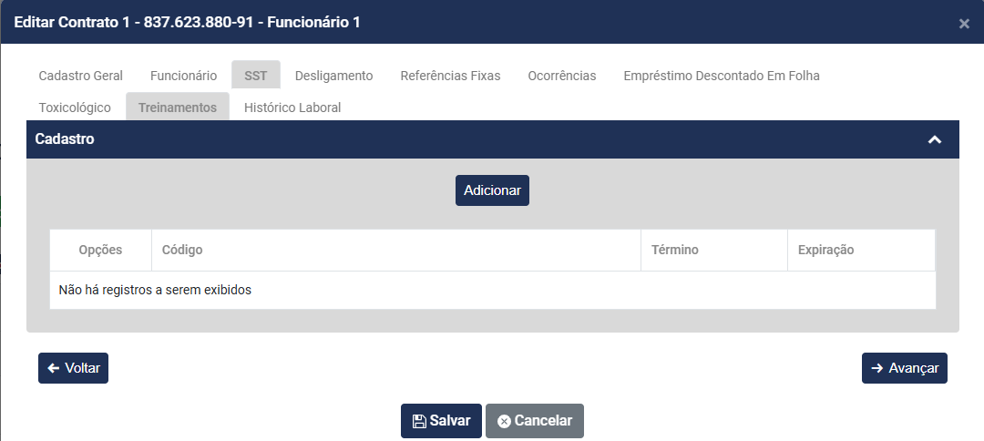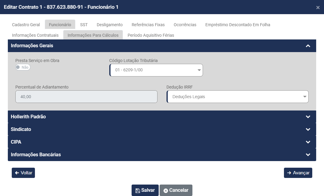 • Nome do funcionário - será preenchido automaticamente a partir do momento que você defina o Código do Contrato