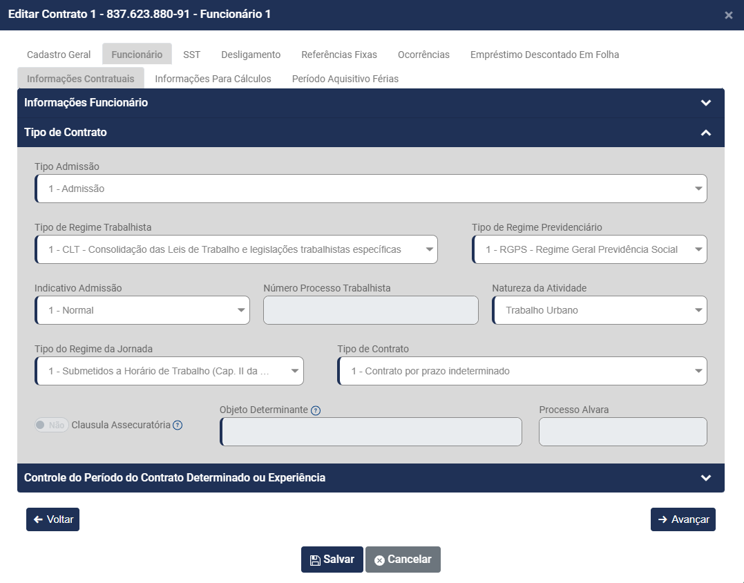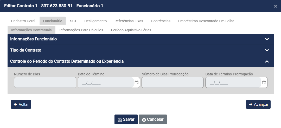 Controle do Período do Contrato Determinado ou Experiência (o campo será habilitado conforme o Tipo de Contrato Informado anteriormente,  informe: