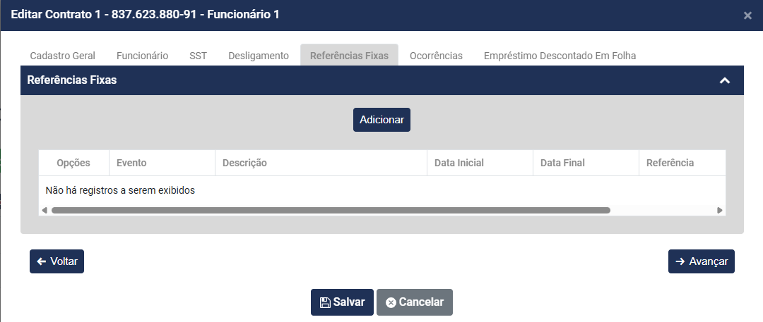 Nas Referências Fixas serão informados Eventos que devam ser calculados para o Trabalhador e que não estão cadastrados no Hollerith Padrão do mesmo, desta forma o Módulo fará o calculo do evento da referência fixa sem que haja necessidade do lançamento do mesmo no momento de gerar o hollerith
