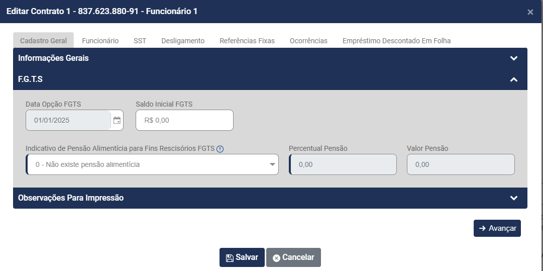• Saldo Inicial do FGTS - Esse campo será informado se a empresa utilizava outro Sistema, onde já aconteceu recolhimento de FGTS para o trabalhador (campo não obrigatório)