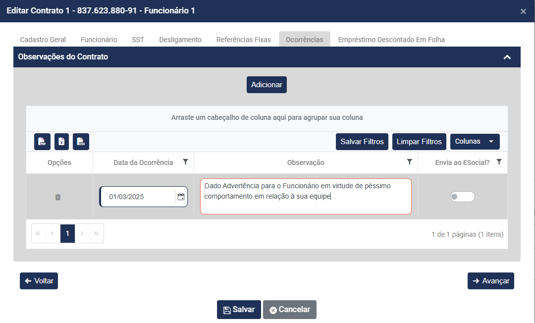 Acesse o botão Adicionar para cadastrar uma nova Ocorrência para o Contrato do Trabalhador