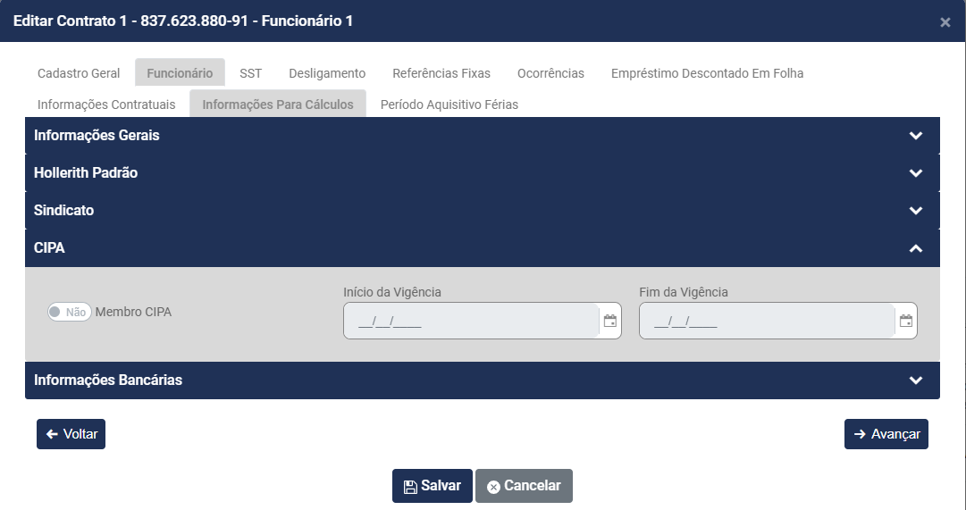 • Fim da Vigência - Esse campo só será habilitado se o Campo Membro da CIPA for definido com Sim