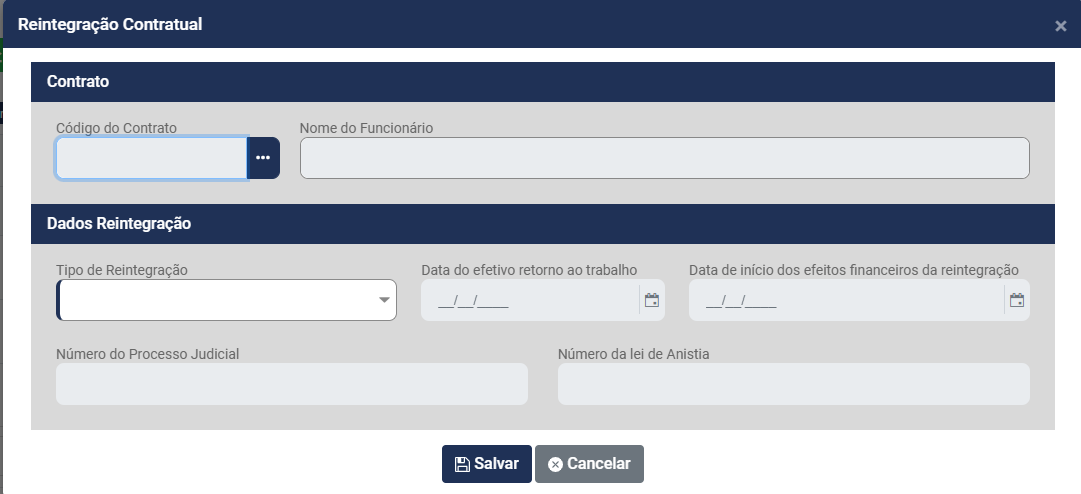 • Tipo de Reintegração (Reintegração por Decisão Judicial, Reintegração por Anistia Legal, reversão de Servidor Público, Recondução de Servidor Público, reinclusão de Militar ou Outros)
