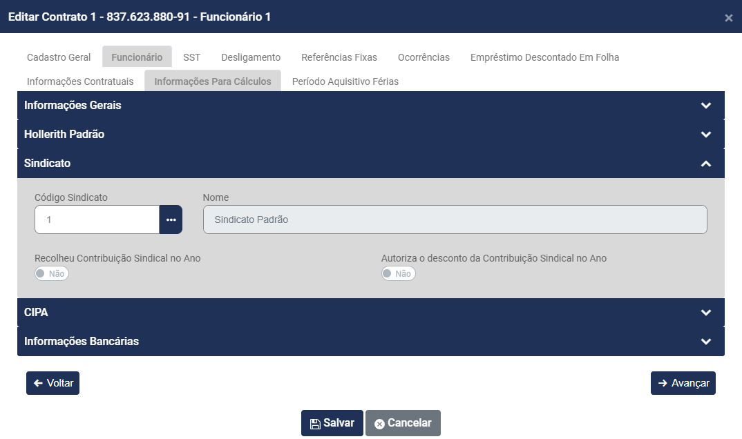• Nome - Esse campo será automaticamente preenchido quando você definir o Código do Sindicato
