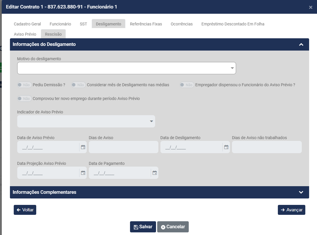 Informações do Desligamento, informe: