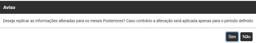 Ao salvar as informações será apresentada a informação "Deseja replicar as informações alteradas para os meses Posteriores? Caso contrário a alteração será aplicada apenas para o período definido" para que você defina sim ou não