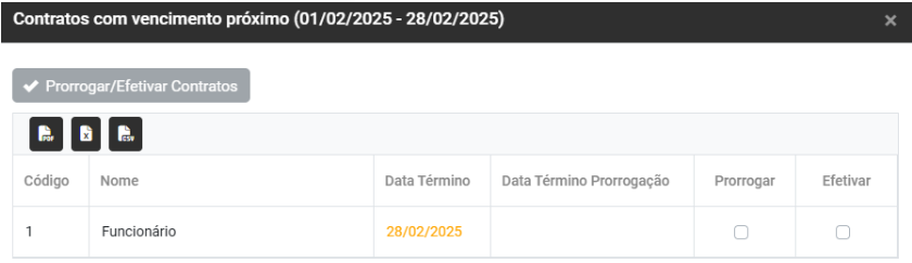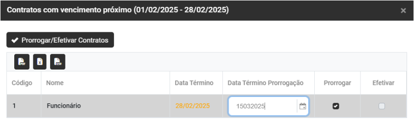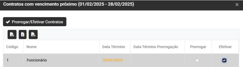 Nesse momento você poderá Prorrogar ou Efetivar o Contrato