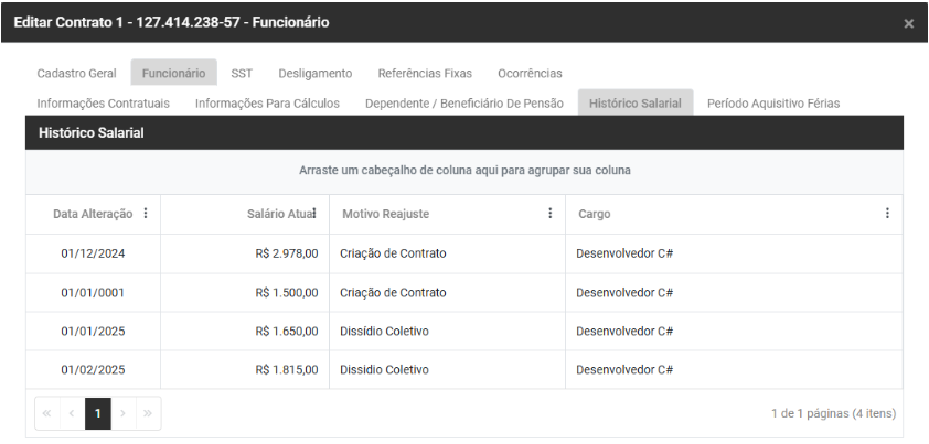 • Salário Anterior - Esse campo será preenchido automaticamente conforme forem sendo cadastradas alterações salariais para esse Contrato
