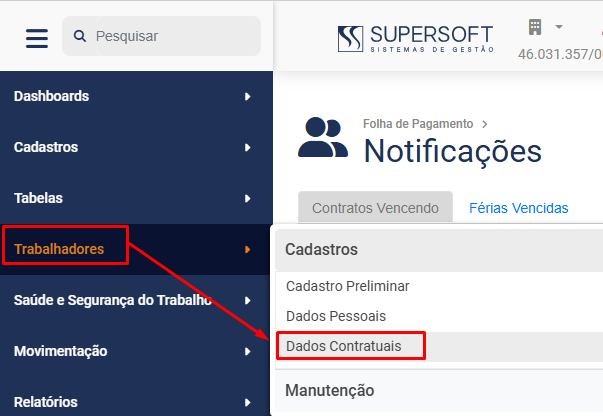 Para cadastrar os Dados Contratuais do Trabalhador você deverá acessar o menu menu Folha de Pagamento>Trabalhadores>Dados Contratuais