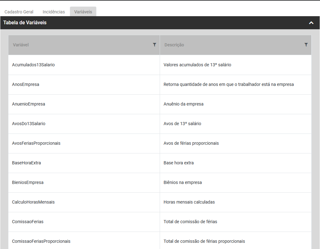 A aba Variáveis será utilizada para que você consulte as Variáveis existentes no Sistema e que poderá ser utilizada para a montagem das fórmulas de cálculo dos eventos.