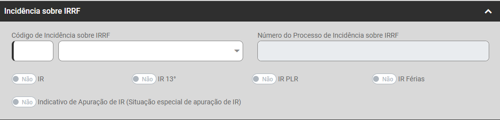 - Número do Processo de incidência sobre o IRRF - Caso haja um processo para esse evento no IRRF, o número do processo deverá ser informado