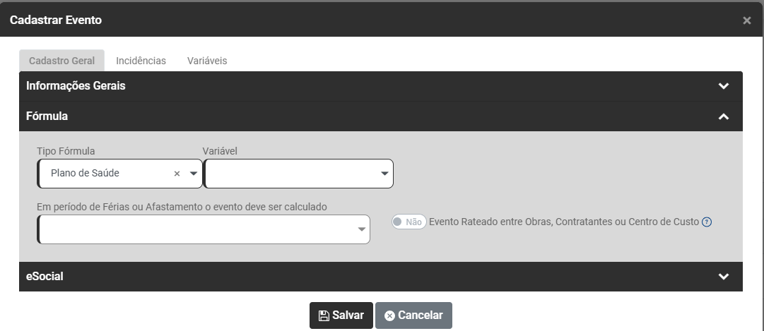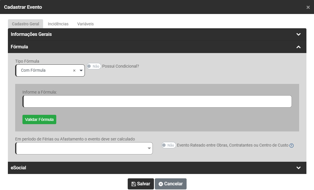 b) Com Fórmula - Será necessário o cadastro de uma fórmula para o cálculo do Evento que poderá utilizar variáveis ou referências em seus cálculos,