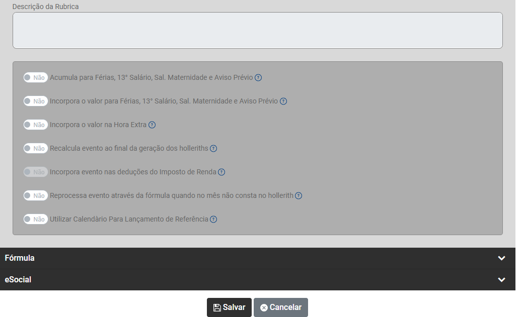 - Descrição da Rubrica (após informar o Código da Rubrica do eSocial este campo será preenchido automaticamente