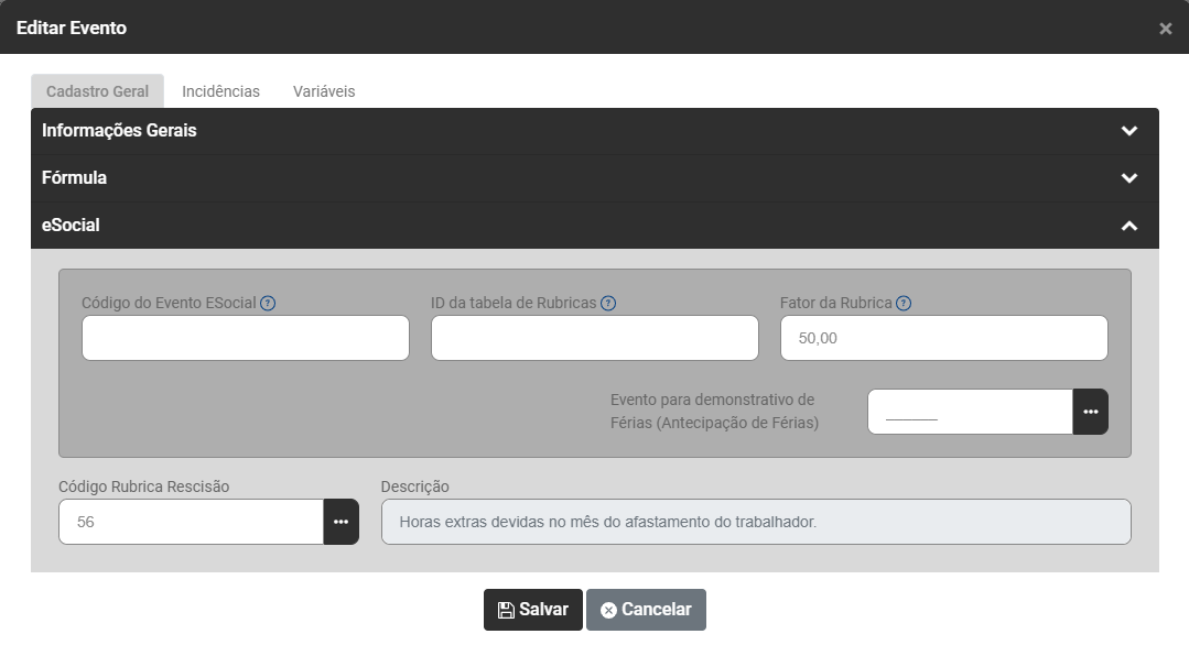 - Código do Eventos para eSocial - Ao salvar sem preenchimento sistema atribui automaticamente o código do evento sequencial. Se preenchido este campo será a informação levada ao esocial nas tags <codRubr> e <ideTabRubr> e não o código do evento do sistema.