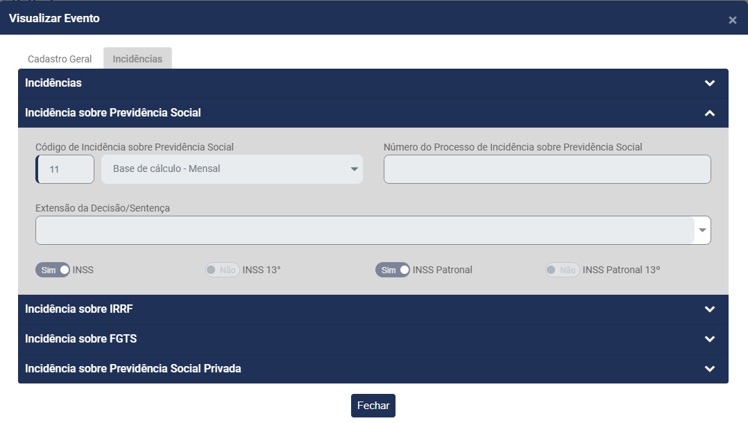 • Código de Incidência sobre Previdência Social - Neste campo informe o código de incidência do evento quanto a Previdência Social que será informado para o Portal do eSocial (será através desta informação que o valor do INSS será calculado no eSocial)