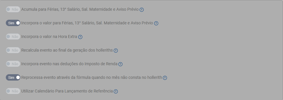 • Acumula para Férias, 13º Salário, Salário Maternidade e Aviso Prévio - Assinale esta opção se este evento deve entrar no acumulo de médias para cálculo de férias, 13° Salário, Sal. Maternidade e Aviso Prévio.