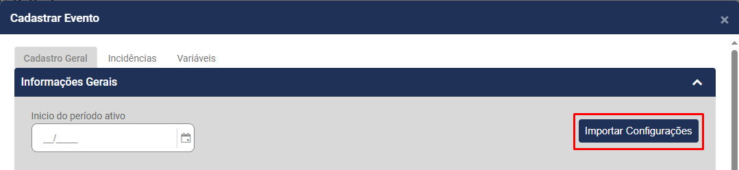 Se você possuir evento cadastrado com a mesma configuração que será utilizada para esse novo evento poderá Importar as Configurações