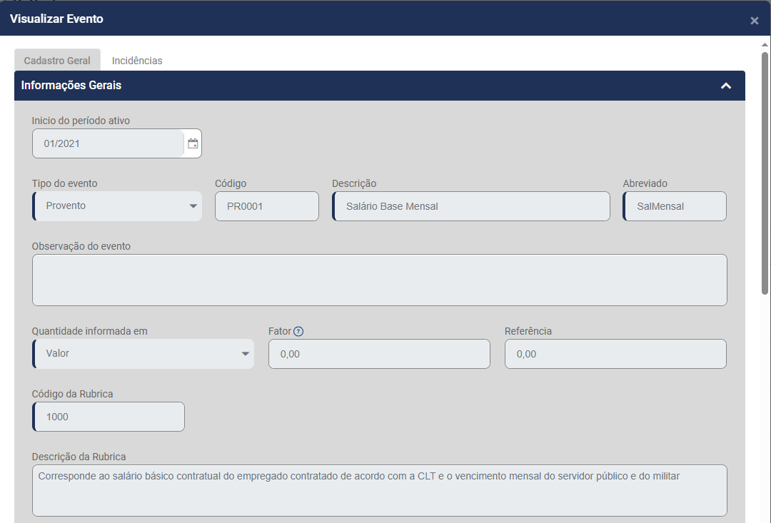 • Abreviado - Nome do evento que será impresso na Folha de Pagamento