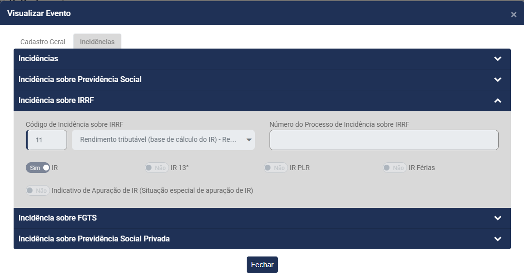 • Defina em seguida se a incidência desse evento é para IR, IR 13º Salário, IR P.L.R., IR de Férias
