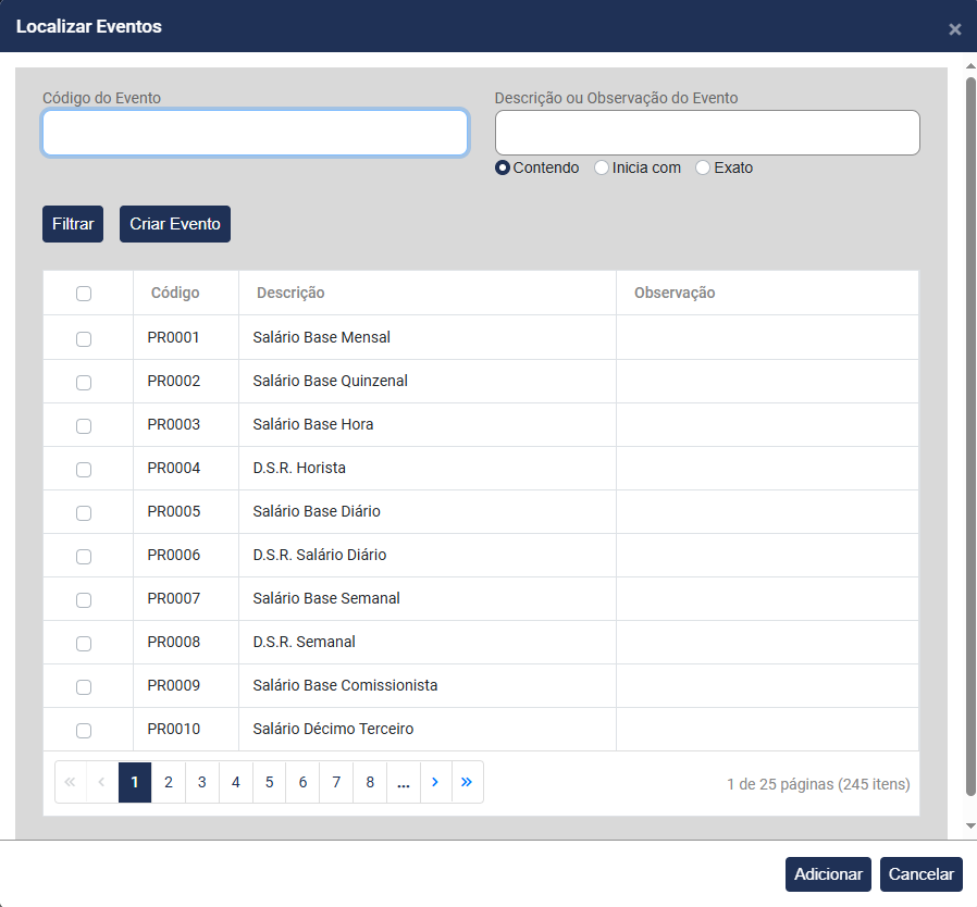 • Tipo de Evento (Desconto, Informativo Dedutora, Informativo, Provento)