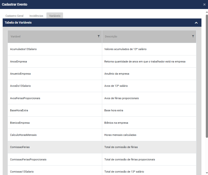 A aba Variáveis será utilizada para que você consulte as Variáveis existentes no Sistema e que poderá ser utilizada para a montagem das fórmulas de cálculo dos eventos.