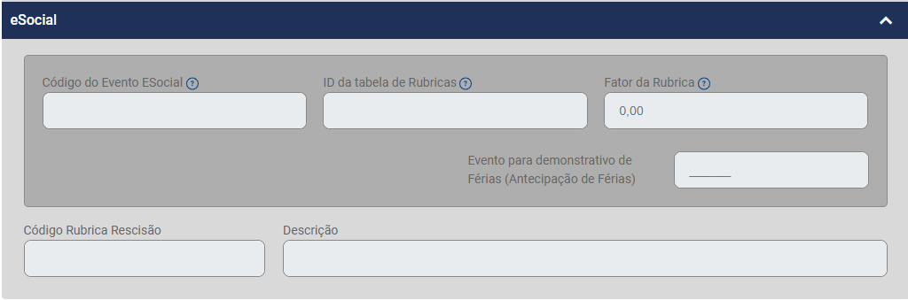 • Descrição da Rubrica (após informar o Código da Rubrica do eSocial este campo será preenchido automaticamente
