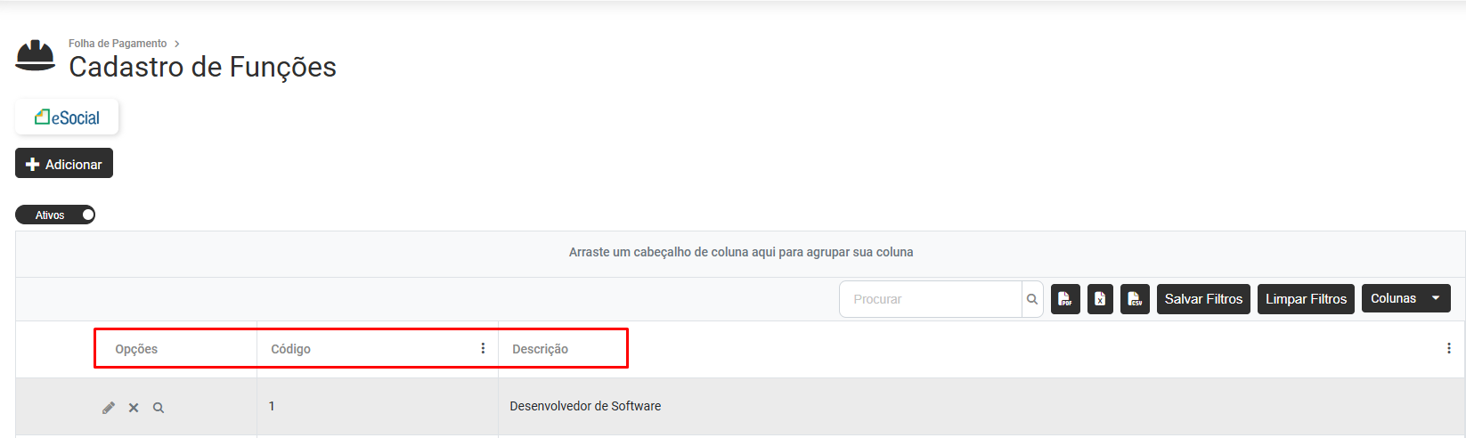 Será apresentada a tela com o Grid das Funções e nele será possível visualizar os campos