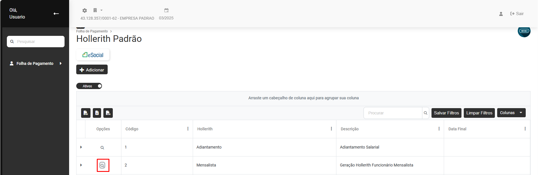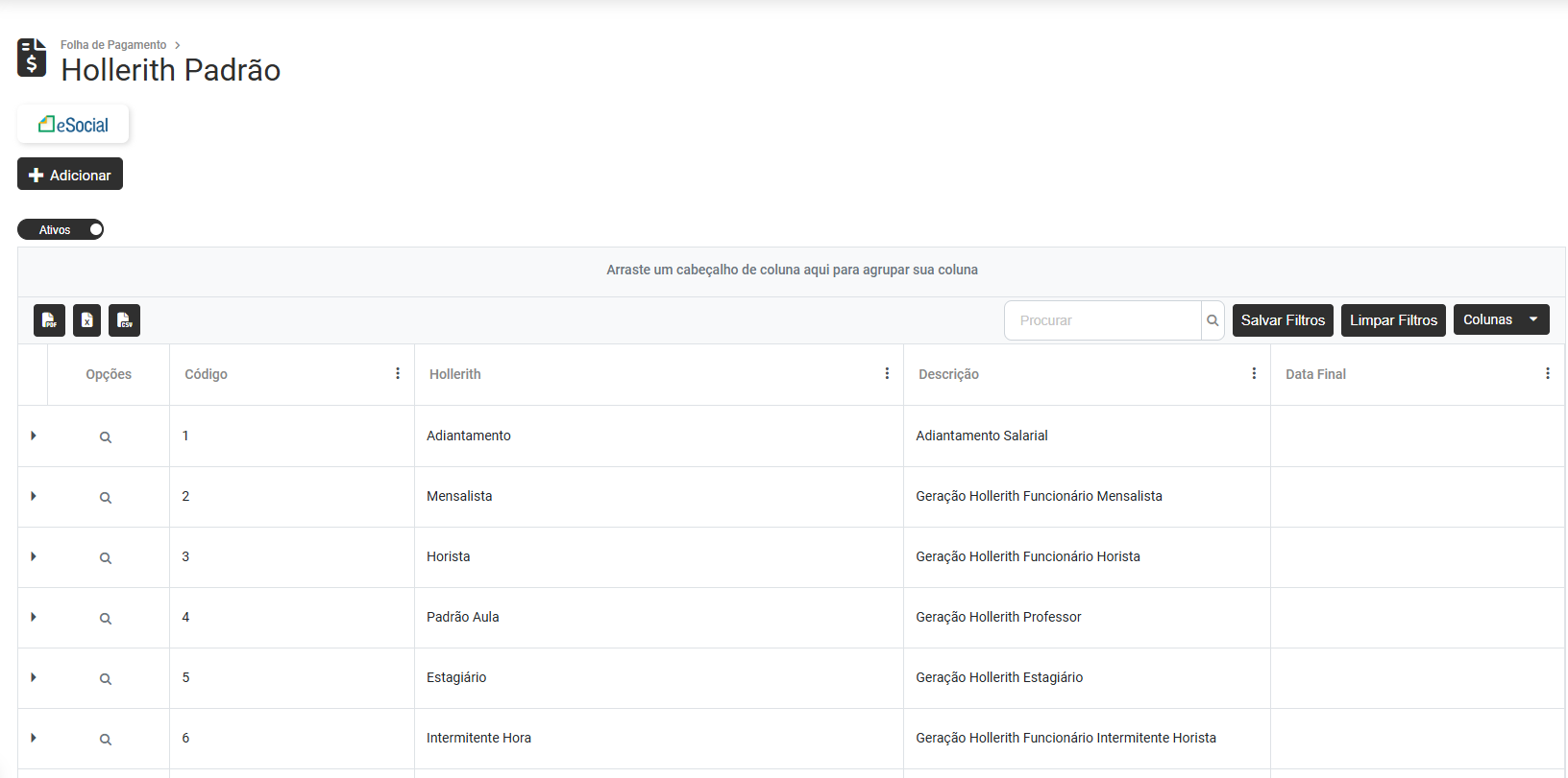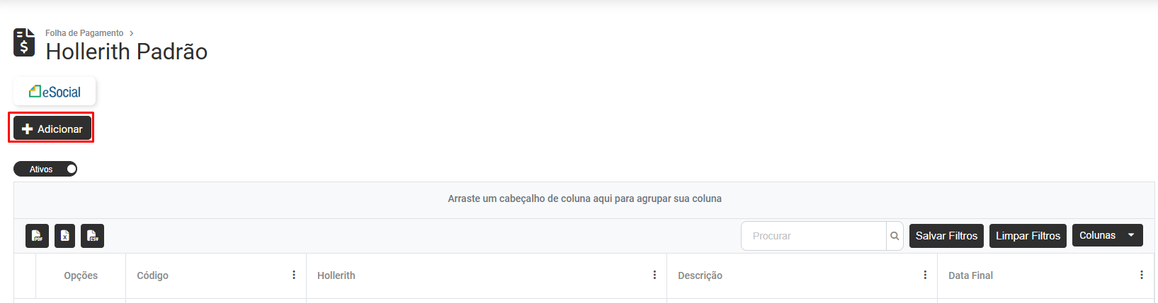 Para cadastrar um novo Hollerith Padrão clique no botão "Adicionar"