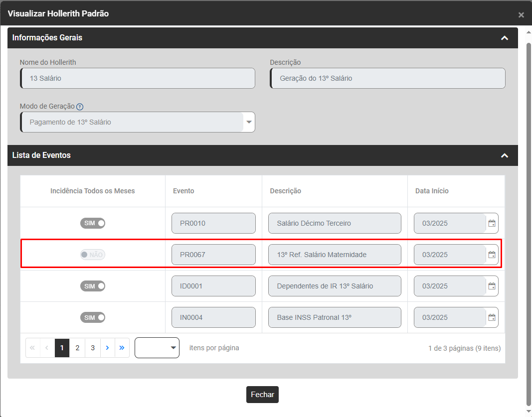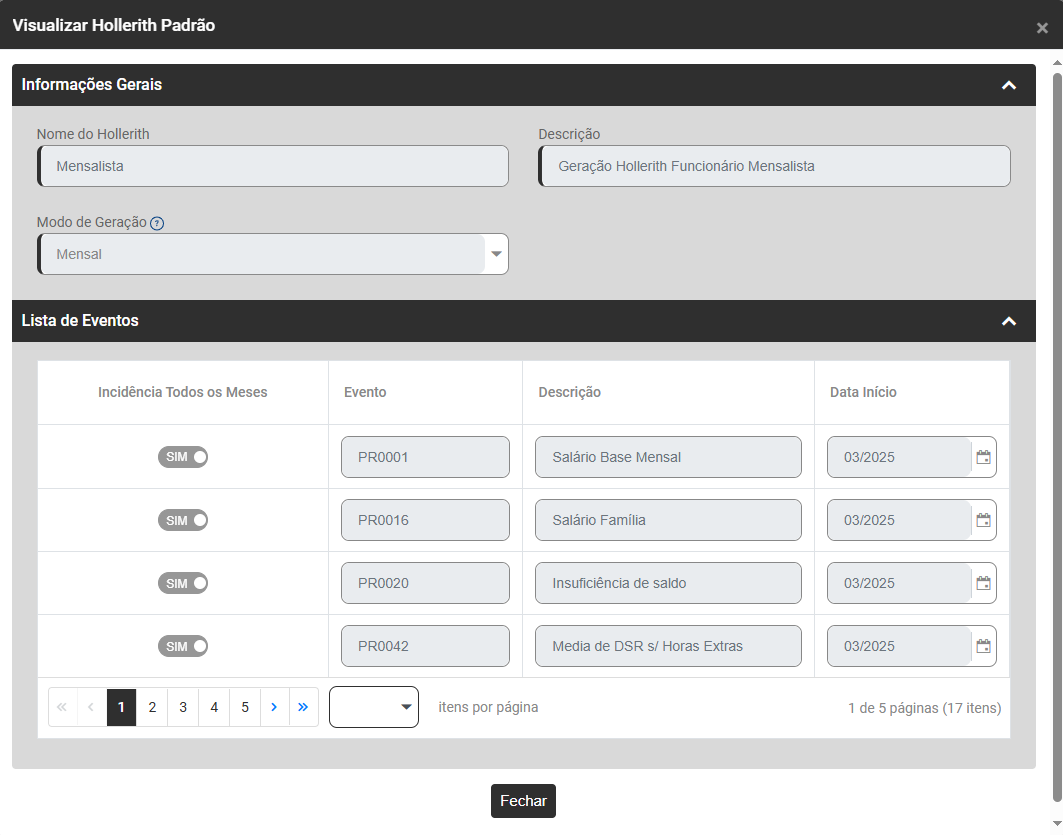Será apresentada a tela com os Eventos cadastrado para o Hollerith Padrão, essa tela não permitirá edição