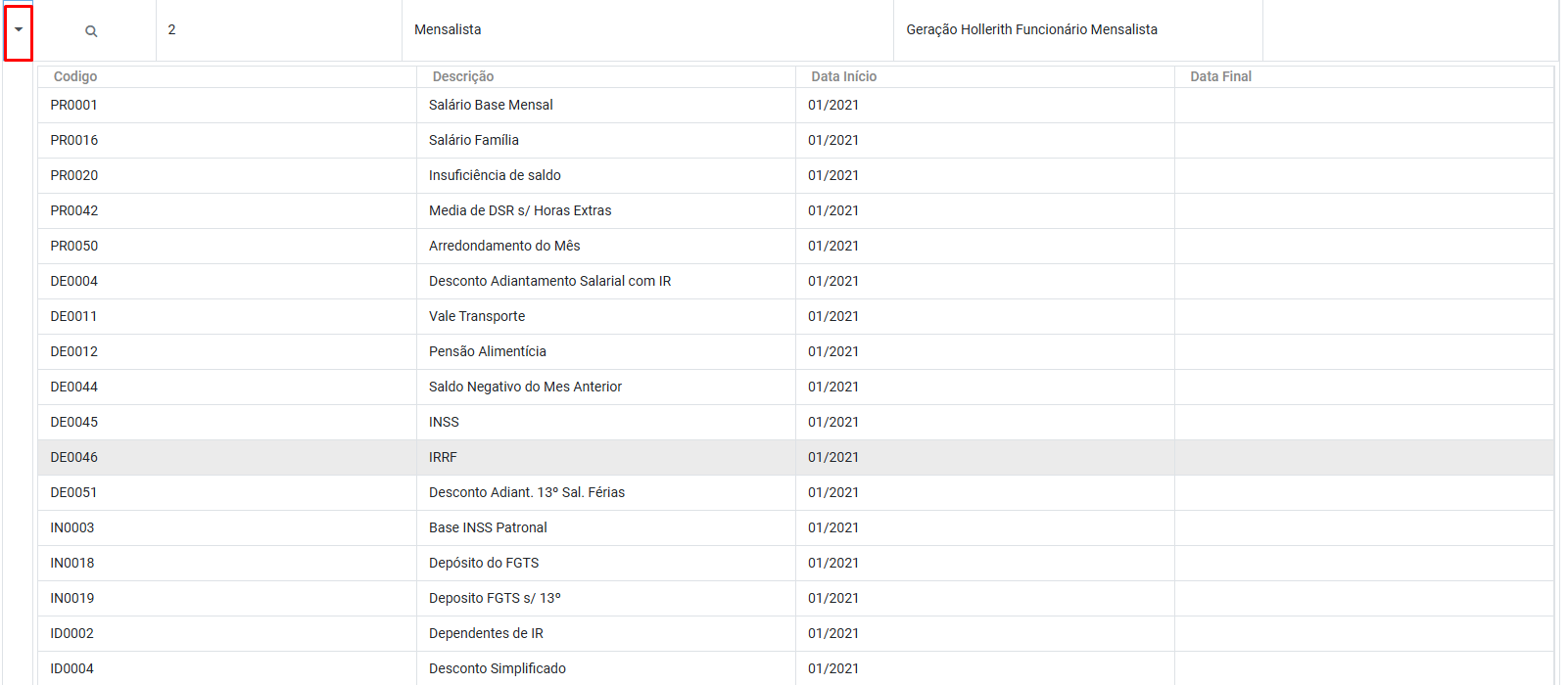 No cadastro dos Holleriths Padrões, clique na seta para expandir as informações e você conseguirá visualizar todos os eventos que estão vinculados ao Hollerith Padrão definido