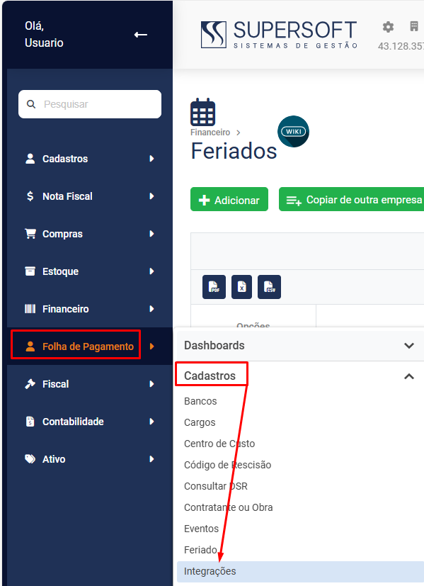 - Folha - Defina Sim para que o Módulo permita a integração com a Contabilidade