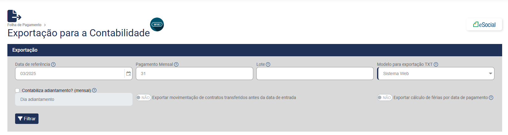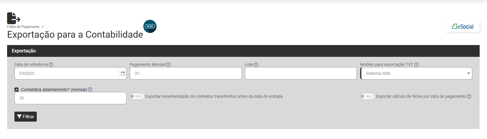 - Contabiliza adiantamento ? - Habilita a contabilização de eventos de adiantamento para a exportação,