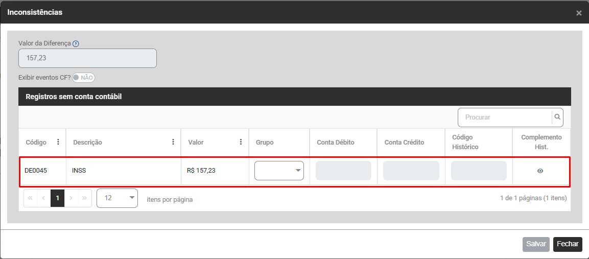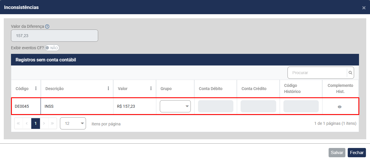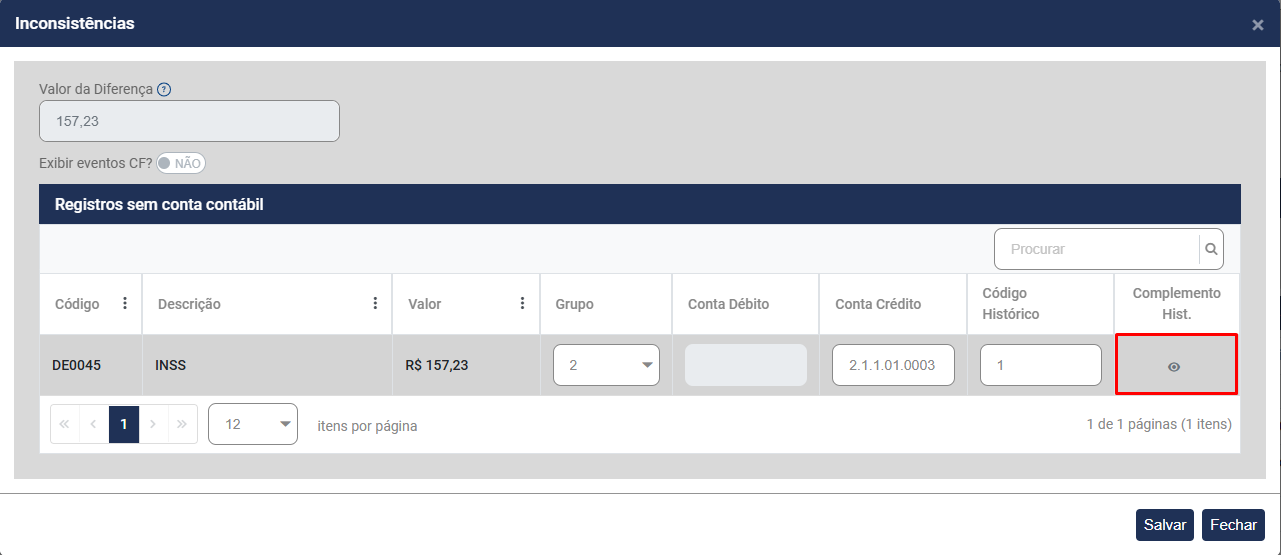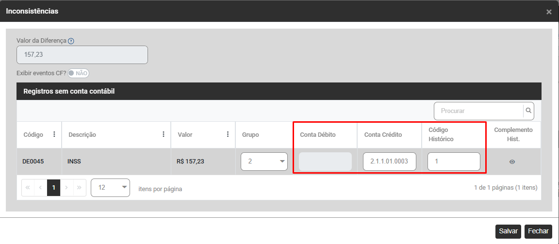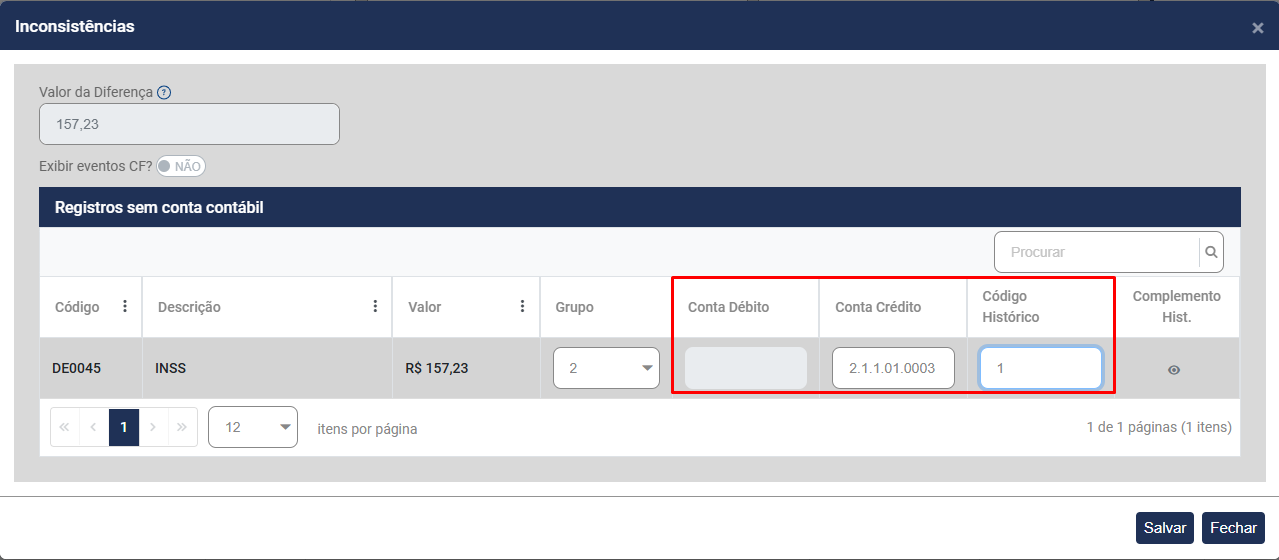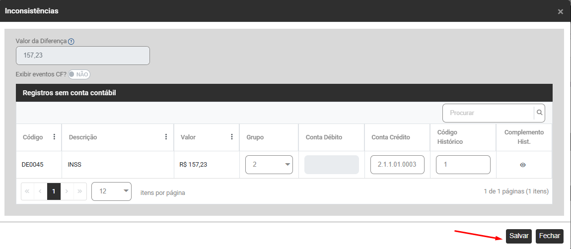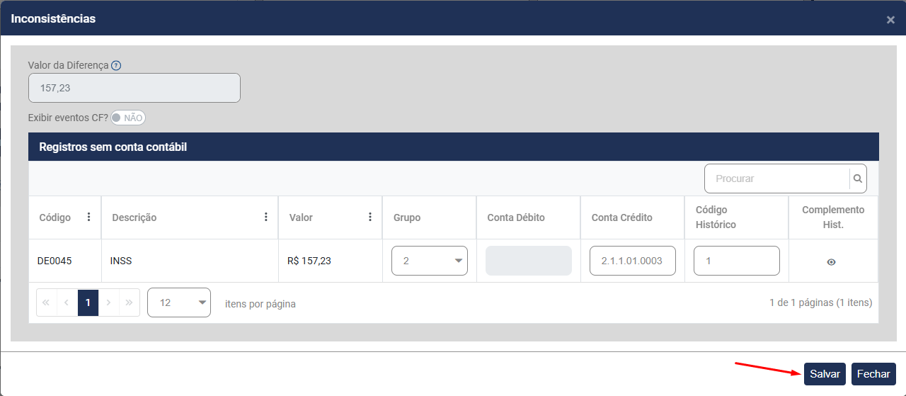 Depois que você cadastrar as Contas Contábeis para todos os Eventos que apresentaram inconsistência, Salve a informação