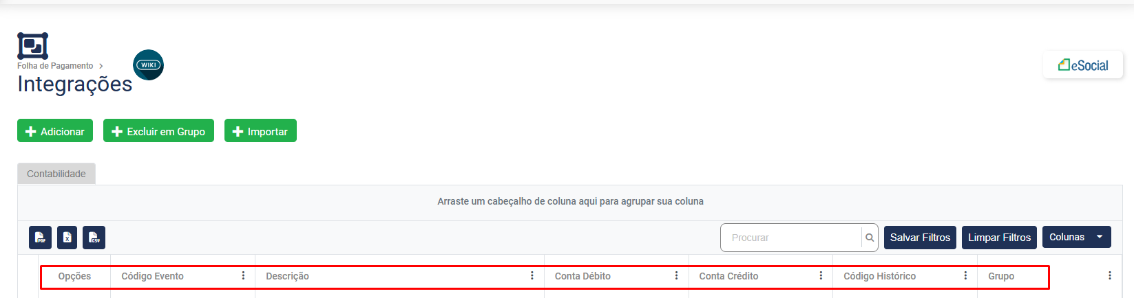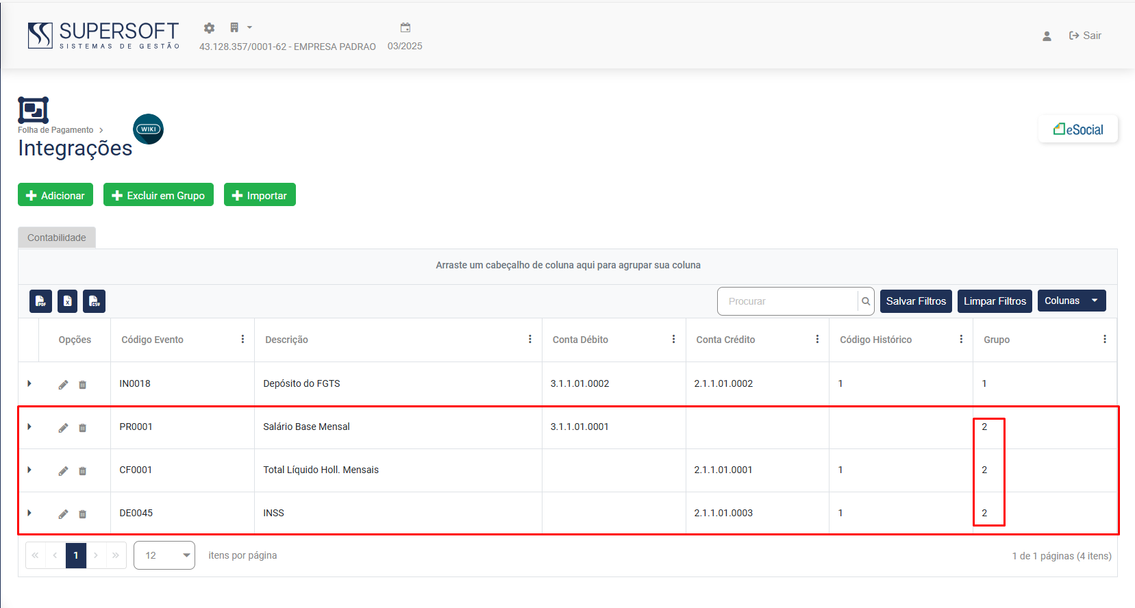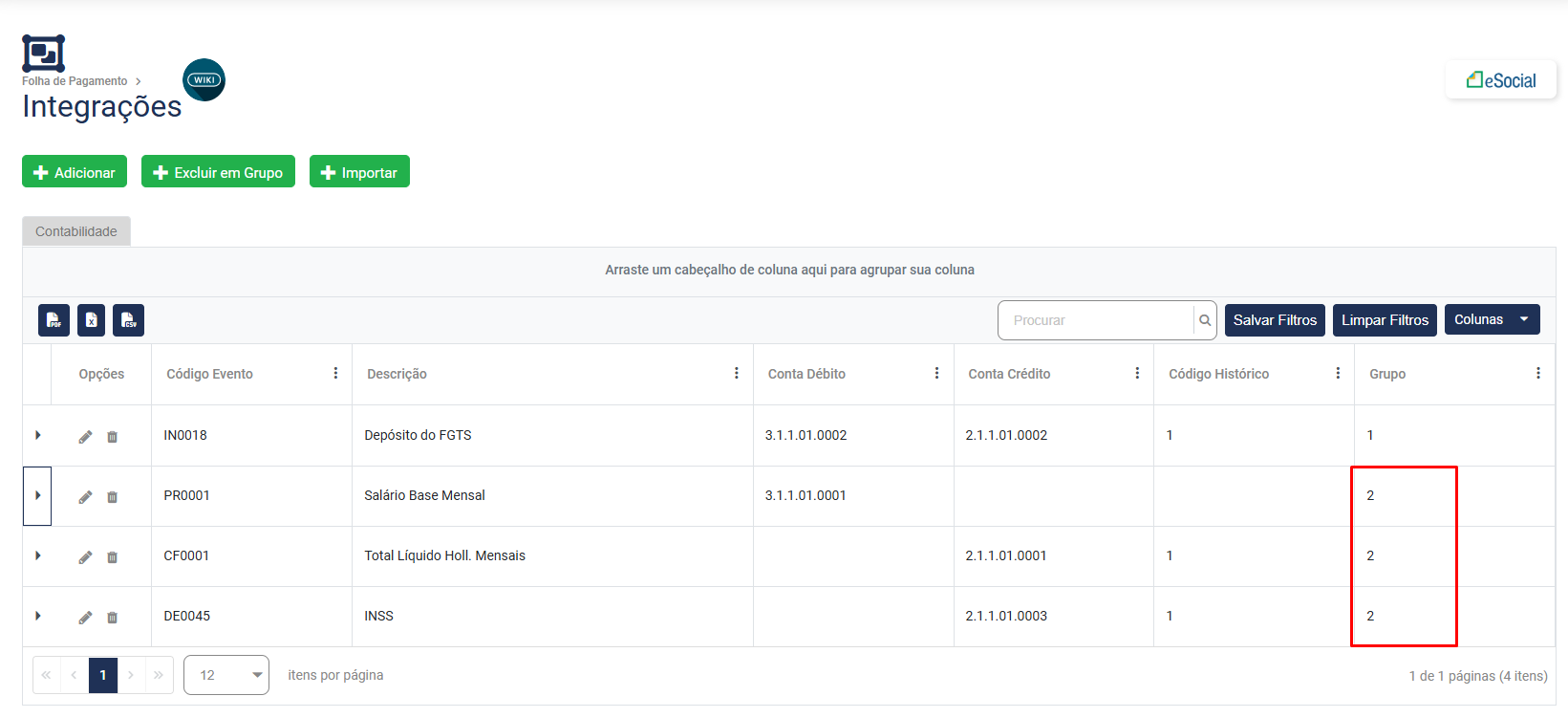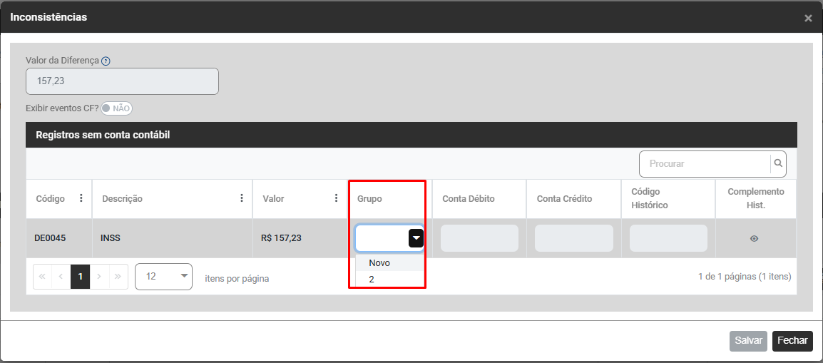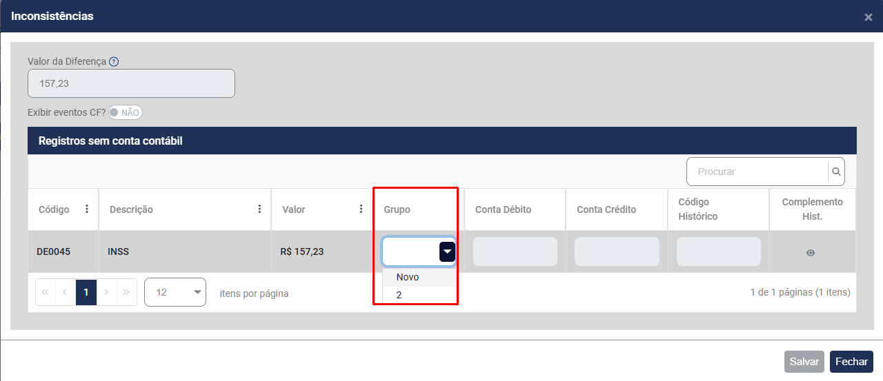 Você conseguirá realizar a integração com o Módulo de Contabilidade na própria tela de Inconsistências, corrigindo desta forma, a inconsistência apresentada, para isso acesse a Coluna Grupo e defina se para esse evento ainda não integrado será criado um novo Grupo ou se você deseja que ele seja incluídos em um Grupo já cadastrado no Módulo (serão apresentados todos os grupos existente para que você faça a definição)