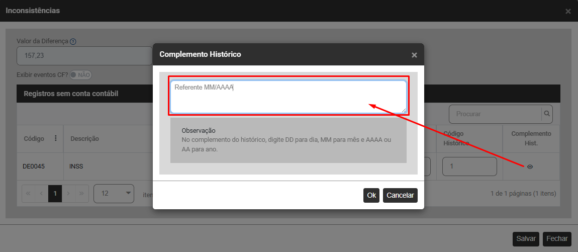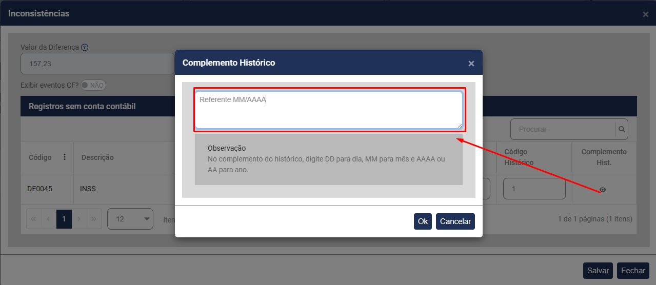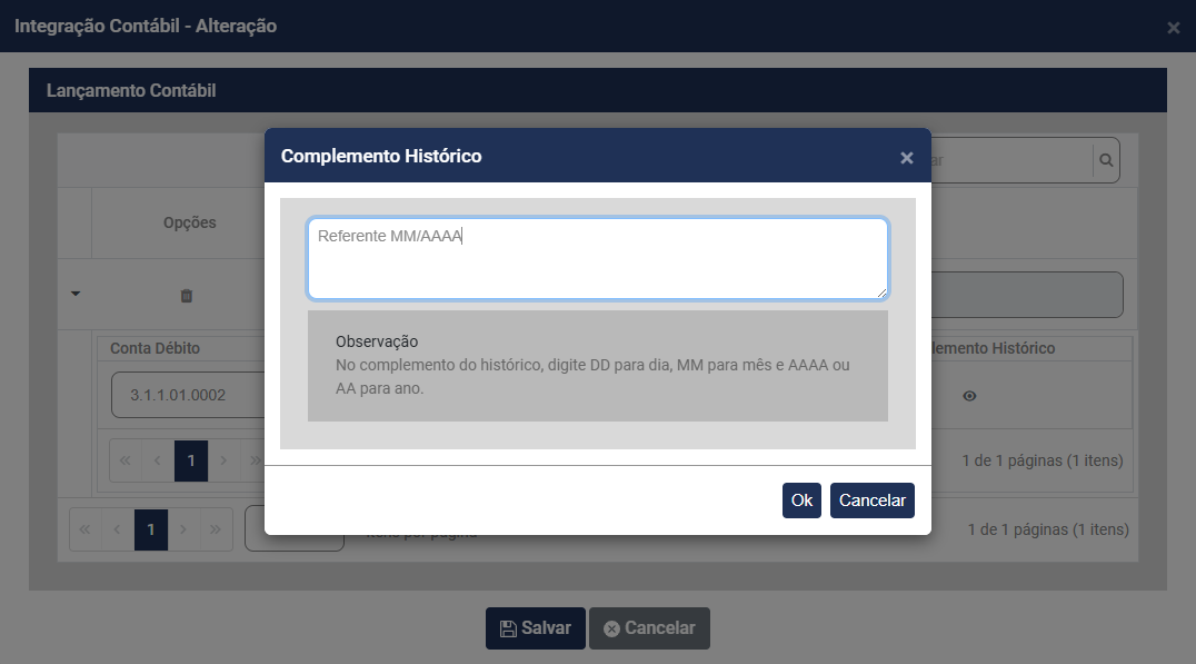 Em nosso exemplo abaixo o Complemento do Histórico será "Referente ao Mês e Ano" do Lançamento Contábil