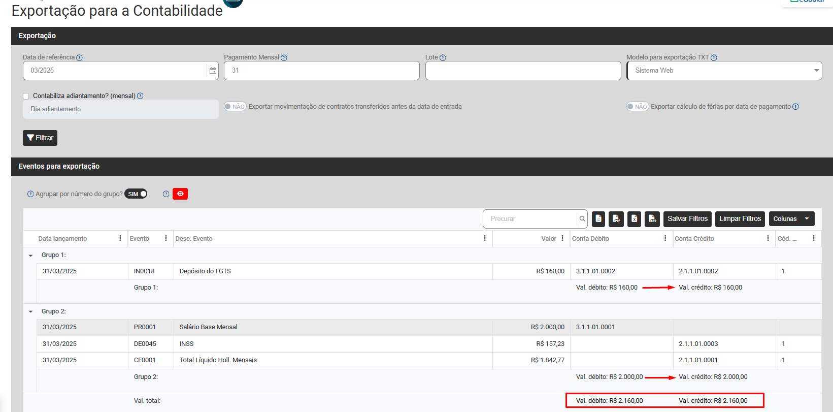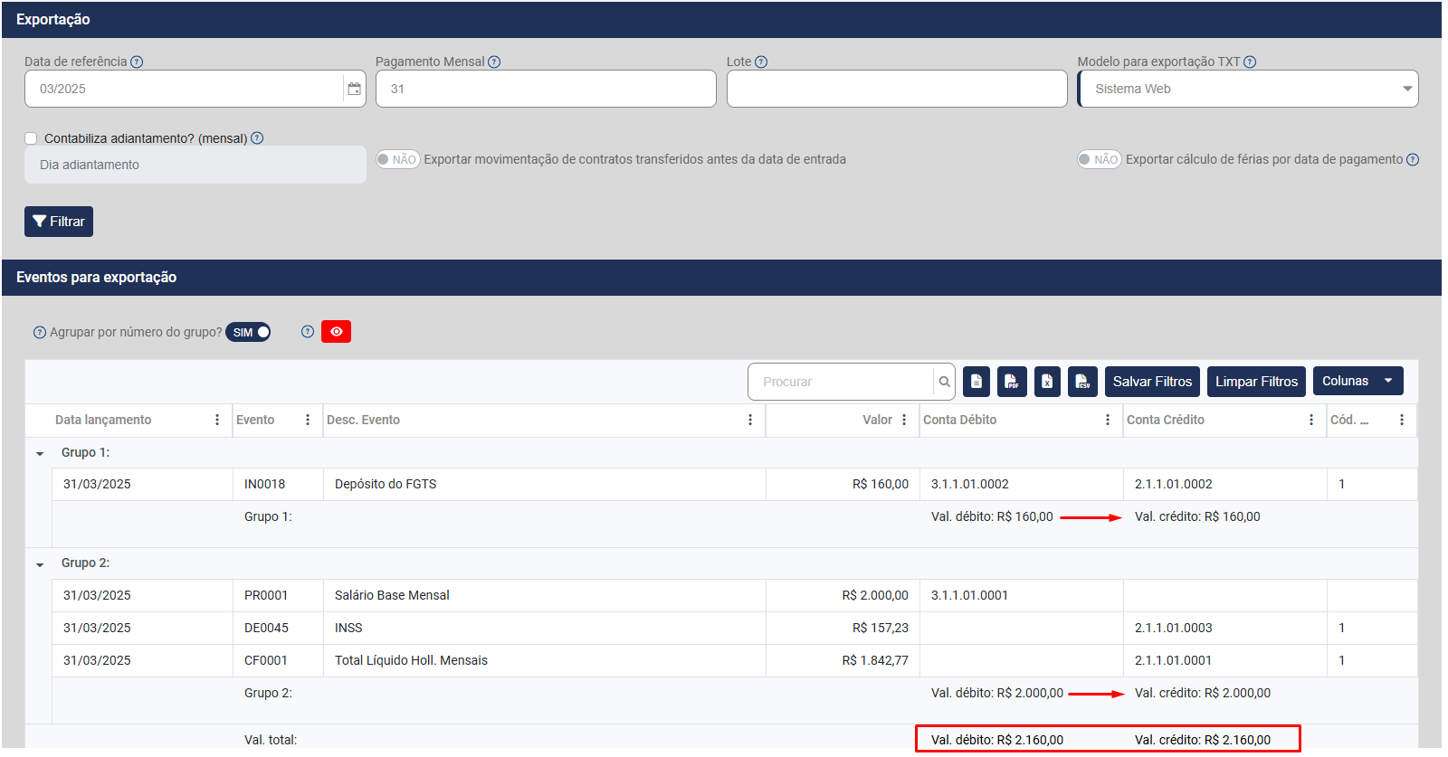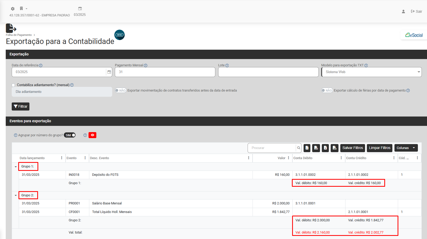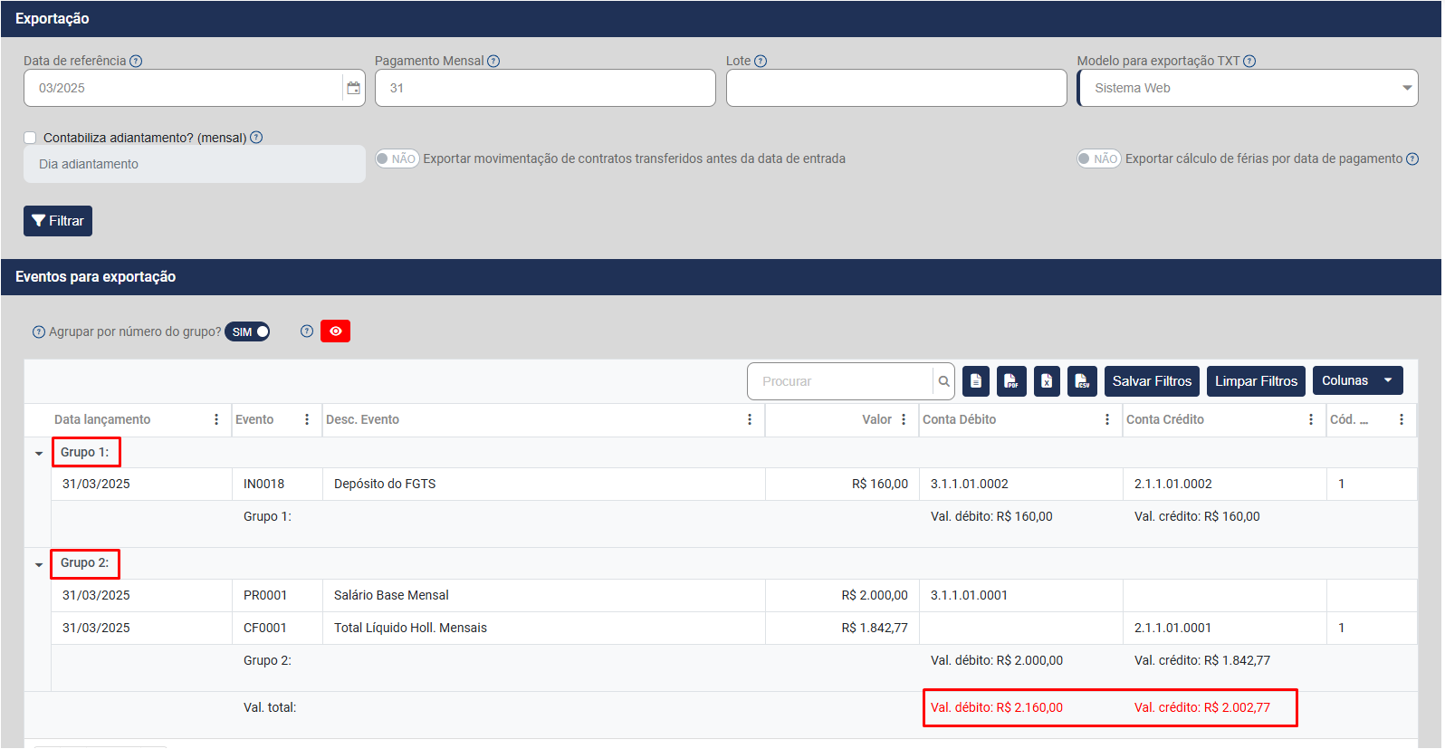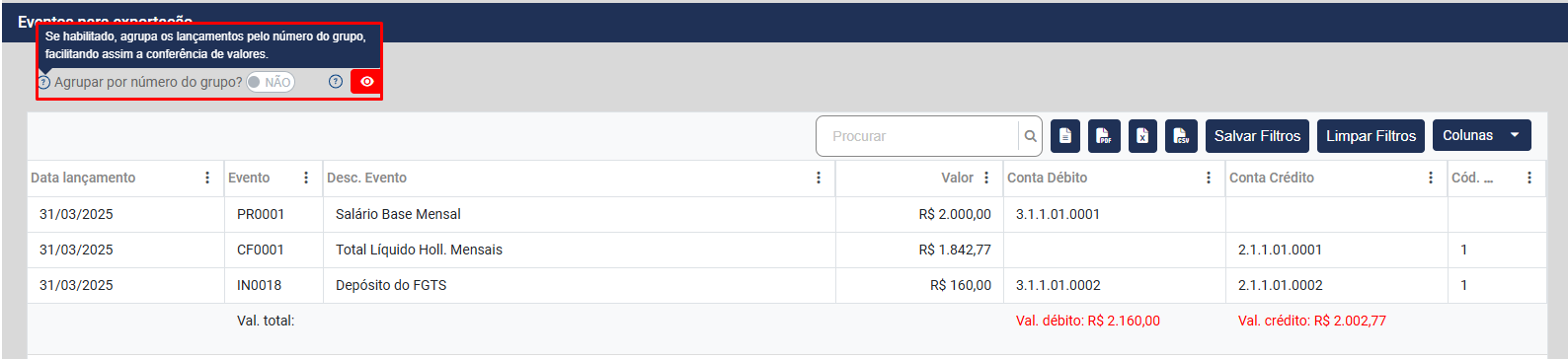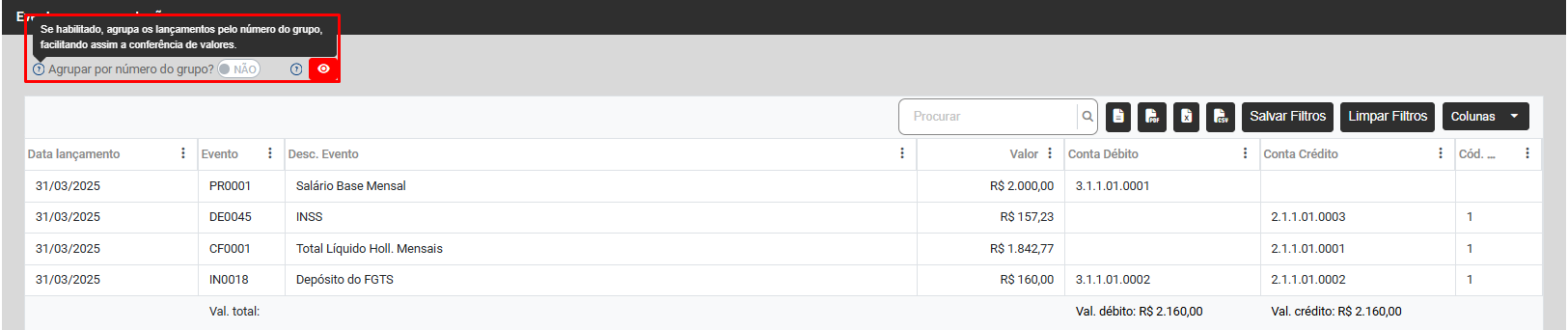 Existe a possibilidade de Agrupar as informações por número do grupo (Se habilitado, agrupa os lançamentos pelo número do grupo, facilitando assim, a conferência de valores.)